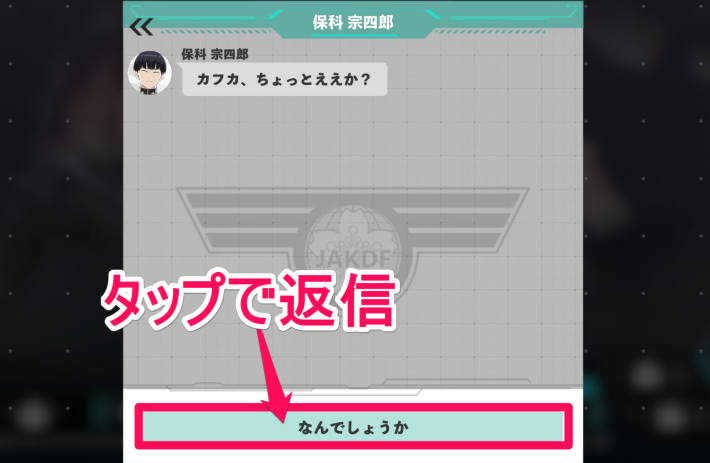 メッセージを開いたら、最後までメッセージを閲覧しましょう。画面下部に青いボタンが表示されるので、タップするとカフカが返信してくれます。