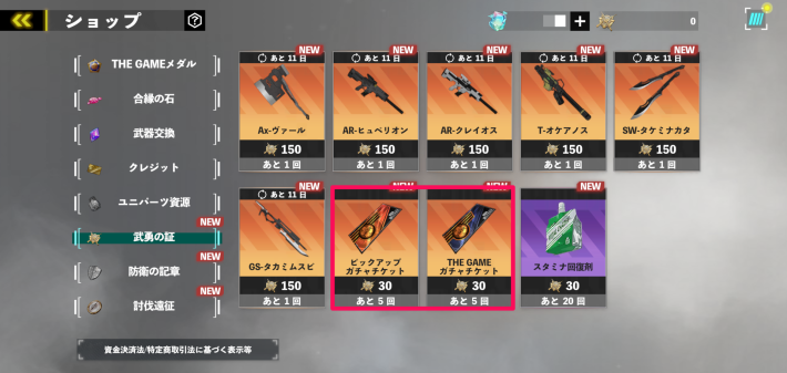 武勇の証でヒュペリオンを入手したら、PUガチャチケット・THE GAMEガチャチケットを入手するのがおすすめです。武勇の証が余ったら、スタミナ回復剤かヒュペリオン以外の星5武器を入手しましょう。