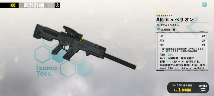 武勇の証で交換おすすめの武器は「AR-ヒュペリオン」です。適正キャラが多く、装備者のATK上昇や味方全体のSPDとATK支援ができる優秀な武器となっています。