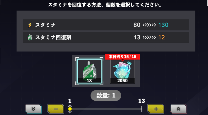 スタミナ回復剤は、スタミナを回復する時に使用します。回復剤を1個消費すると、スタミナが50回復します。
