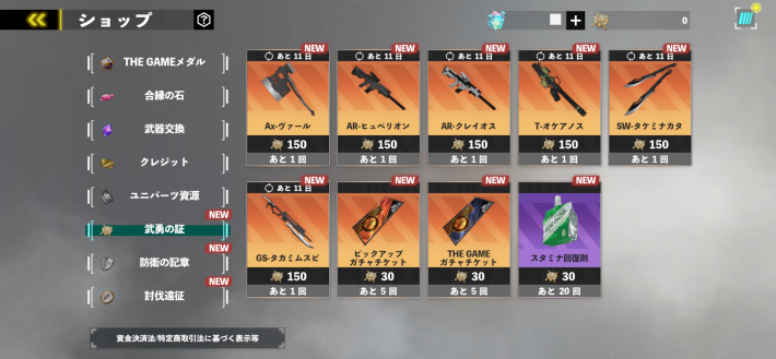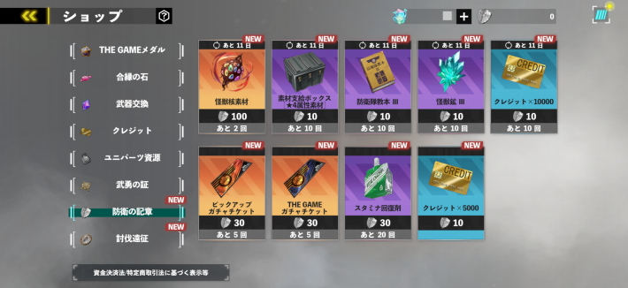 ショップ「防衛の記章」でも、スタミナ回復剤を入手することができます。当ショップを利用するには、激戦エリアやイベント「大規模制圧戦」の星獲得報酬で「武勇の証」を獲得する必要があります。
