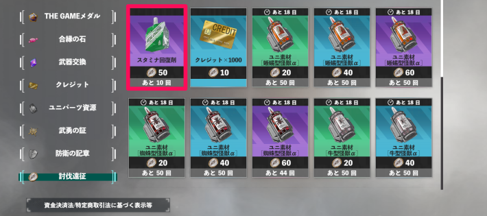 ショップの「討伐遠征」で、スタミナ回復剤を入手することができます。当ショップを利用するには、討伐遠征をプレイして「遠征ポイント」を獲得する必要があります。