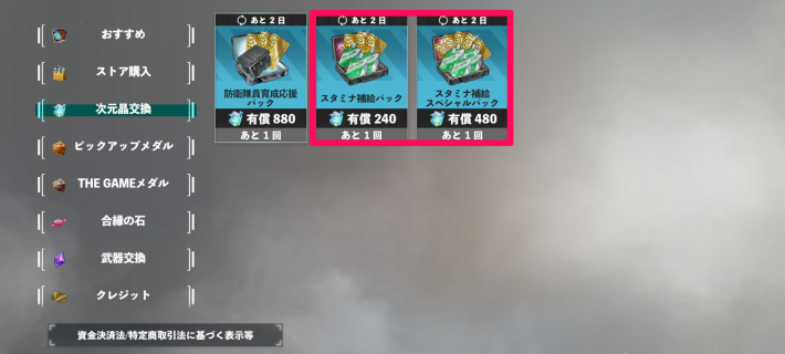 ショップの「次元晶交換」には、スタミナ回復剤が貰えるパックが2つ販売されています。次元晶交換でパックを購入するには、有償の次元晶が必要です。