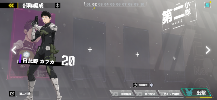 実績「孤軍奮闘」は、星5キャラ「怪獣8号」単騎では達成できません。日比野カフカ単騎で演習に挑みましょう。