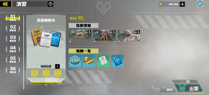 カフカの育成が完了したら、演習をプレイしましょう。出現する敵のLvが1と低く、クリアしやすい「基本素材の難易度01」がおすすめです。