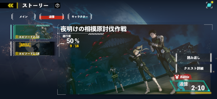 まず追憶ストーリーを解放するため、メインストーリーを0-7までクリアしましょう。追憶ストーリーが解放後、2-10まで追憶ストーリーを進めましょう。