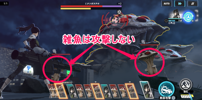 | 1回目 | ミクソガステロに通常攻撃を当てる ※ボスが召喚する雑魚2体は攻撃しない |