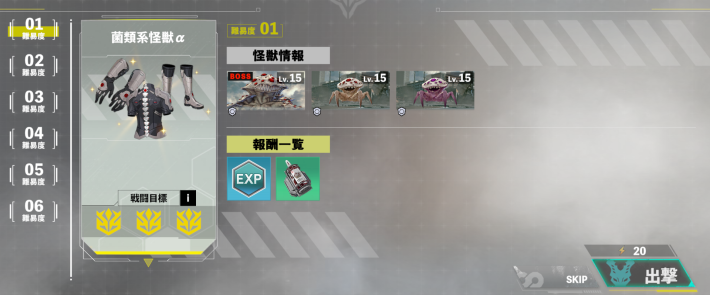 演習:ユニ素材を解放したら、ミクソガステロが出現する「菌類系」のステージを攻略しましょう。ミクソガステロのレベルが低い難易度01がおすすめです。