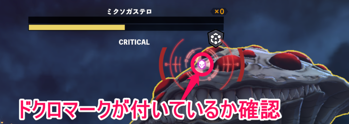 必殺技発動時、ボス(ミクソガステロ)にドクロマークが付いているか確認しましょう。ドクロがついていない場合、画面右上にある一時停止ボタンをタップし、バトルをやり直しましょう。