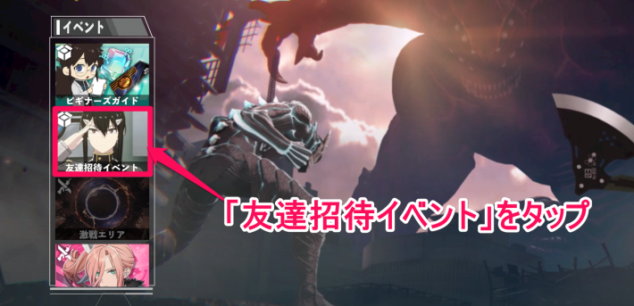 TOP画面左側にある「イベント」から、【友達招待イベント】のアイコンをタップし、イベントページを開きましょう。