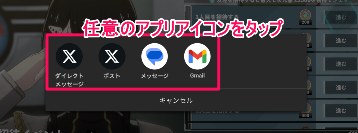 | Point! | 当手順でアプリを選択せずにキャンセルをすると、ミッション「イベント画面をシェアする」が達成となります。 |