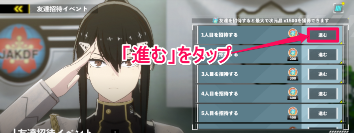 友達招待やイベントシェアで次元晶が貰えます。当イベントでは、最大1500個の次元晶が獲得可能です。
