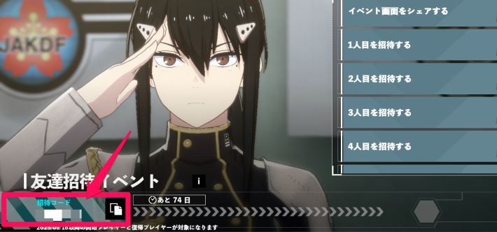 自分の招待コードは、イベント画面左下にある「招待コード」で確認可能。コードの右側にあるボタンをタップすると、コードがコピーされます。