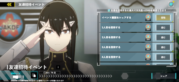 9/16(火)17時から、友達招待イベントが開催!招待コードを使って友達を招待すると、最大で次元晶1500個が貰えます。