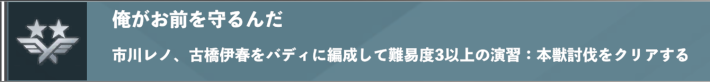 実績「俺がお前を守るんだ」は、市川レノと古橋伊春をバディにした部隊で難易度3以上の演習:本獣討伐を1回クリアすると獲得できます。