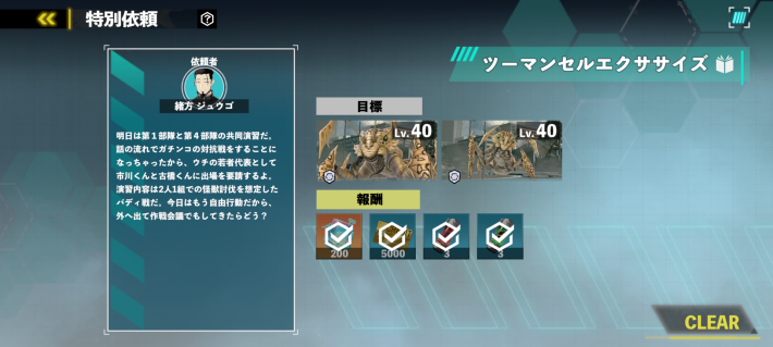 レノと伊春をバディにした部隊で、演習:本獣討伐の難易度03を1回クリアしましょう。難易度03に出現する敵のレベルは50なので、部隊に編成するキャラのレベルは50以上にするのがおすすめです。