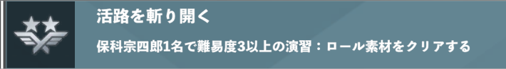 実績「活路を斬り開く」は、保科宗四郎単騎で難易度3以上の演習:ロール素材を1回クリアすると獲得できます。