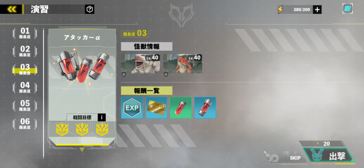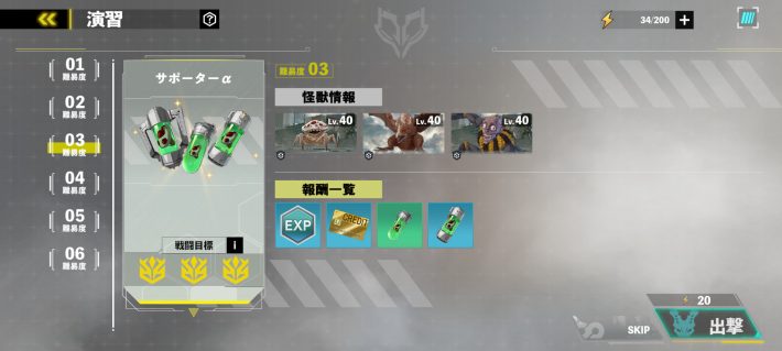 保科の育成が完了したら、演習:ロール素材をプレイしましょう。保科は斬属性キャラなので、斬・物理属性が有利な「サポーターαの難易度03」を攻略するのがおすすめです。