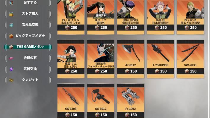 THE GAMEメダルの交換ではメダル150枚で武器を入手可能で、交換できる武器一覧は上記の通りです。