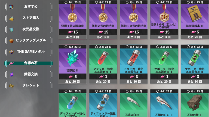 戦功章はショップ内にある「合縁の石」タブでも入手可能で、こちらは月単位で交換数に上限があります。ショップには他にもガチャチケットや怪獣核素材と言った貴重なアイテムが存在するため、優先度の高いものを交換した後に戦功章の入手を検討しましょう。
