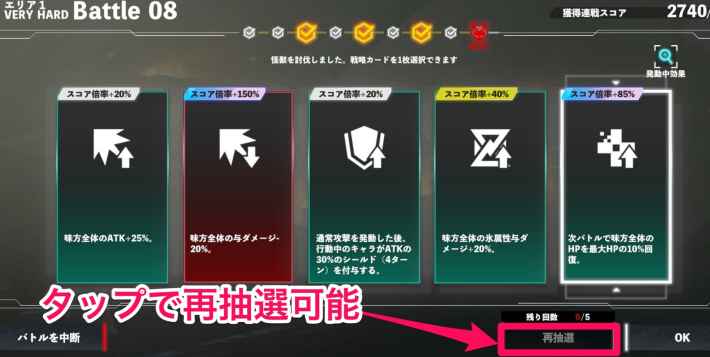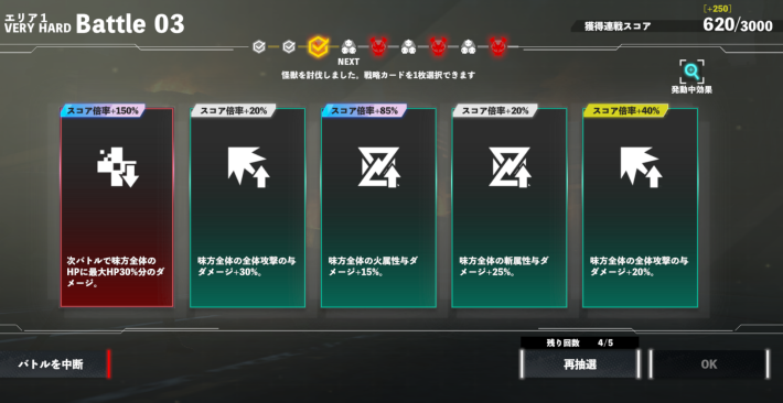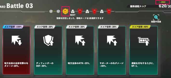 戦略カードはバトル終了時に1枚選択可能で、カードのスコア倍率分そのバトルの連戦スコアの値をUPできます。カードには「バフ・回復」と「デバフ」効果の2種類があり、デバフ効果は味方に不利な効果とはなりますが、スコア上昇値は高いです。カードの選択でスコアは変化するため、活用して高スコアを狙いましょう。