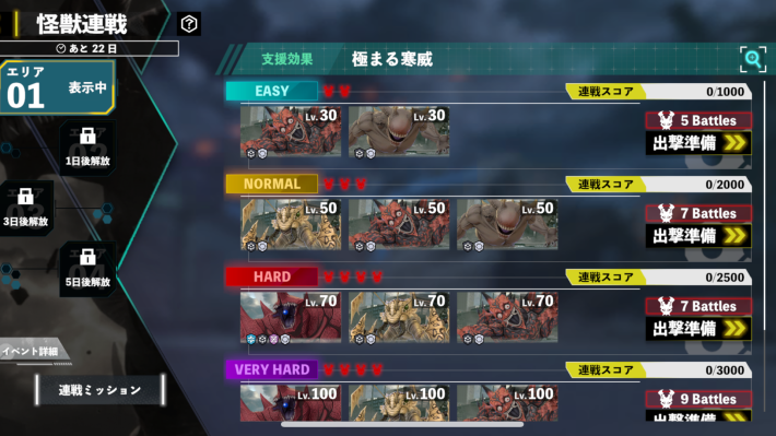 怪獣連戦は複数のエリアに分かれており、1エリアにつき4種類の難易度があります。エリアの解放日時は上記の通りで、イベント期間中2日ごとに解放されます。