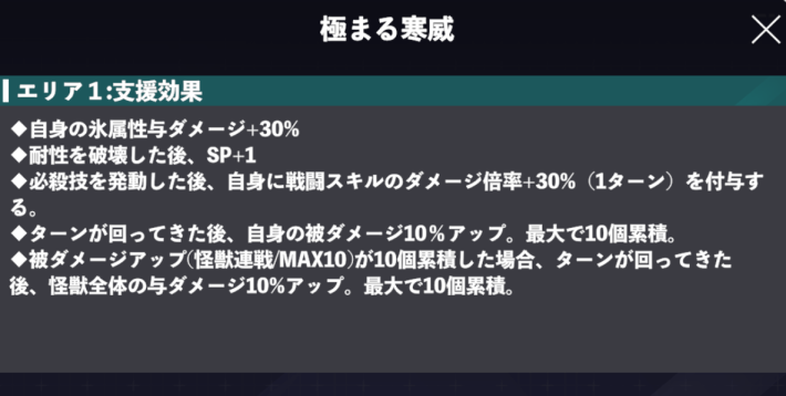 エリア1の「極まる寒威」の支援効果は、上記の通りです。氷属性の与ダメ増加や、必殺技発動後の戦闘スキルダメージUP、耐性破壊後にSP回復が可能なため活用しましょう。また、ターン後の被ダメ増加や怪獣の与ダメ増加もある点には注意し、耐久には気を配りましょう。