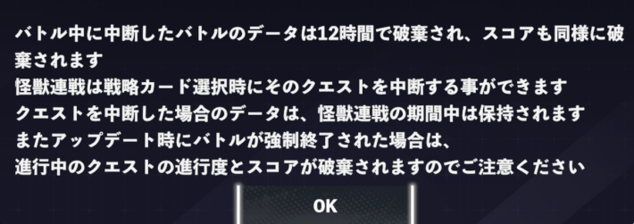 怪獣連戦は戦略カード選択の際に、中断することが可能です。ただ、バトルの中断データは12時間までの保持となり、過ぎるとクエスト進行度と連戦スコアは破棄されるとのことなので、把握しておきましょう。