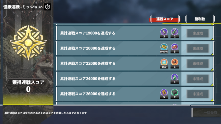 | 累計連戦スコア22000を達成する | 次元晶×150 怪獣核素材×1 |