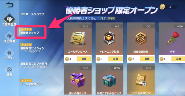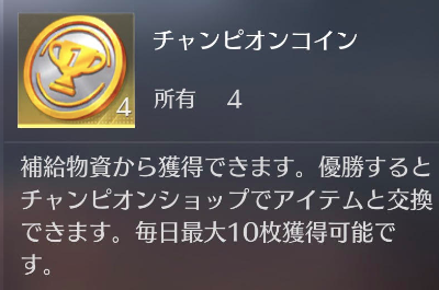 チャンピオンコインは、順位報酬や補給物資から獲得できる合計数で、1日10枚までしか獲得できないため注意しよう。