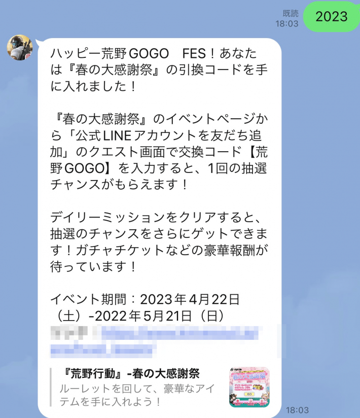 公式LINE友達追加後に、「2023」と入力し送信すると1回の抽選チャンスをゲットできる。