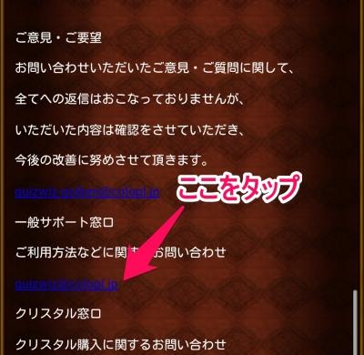 ページ下部にある一般サポート窓口の「quizwiz@colopl.jp」をタップ。