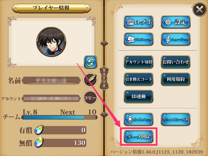 プレイヤー情報のデータ削除のボタンから、アカウントの削除が可能。データ削除をするとそのアカウントの全データが削除され、他のサーバーのキャラ情報も削除される点は注意。