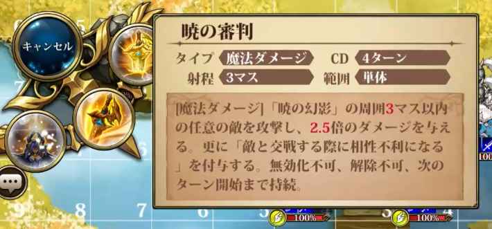 暁の審判は、暁の幻影の周囲3マスの敵に使用する単体攻撃。目標に「交戦時に相性不利になる」デバフを1ターン付与する。