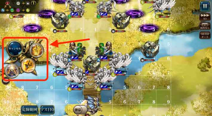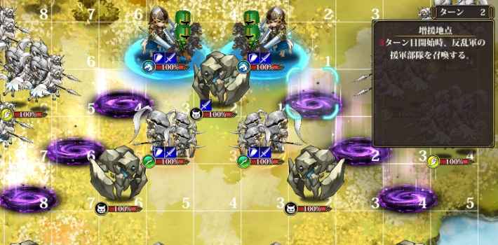 3ターン目開始時に、渦の地形から増援が出現。増援はこの1度限りなため、出現までに初期配置の敵をできるだけ減らしておこう。