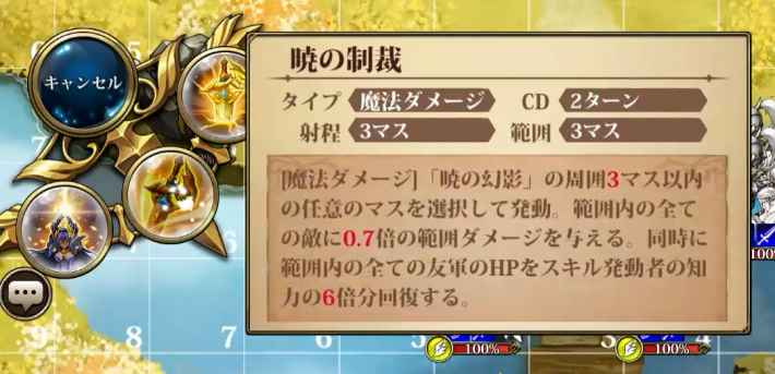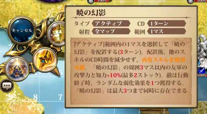 指定位置に暁の幻影を配置する。その周囲3マス以内の友軍は攻撃/知力がアップし、3つまで配置可能。