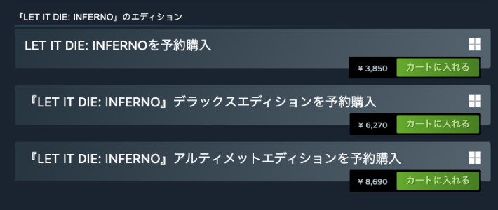 Steamの「LET IT DIE: INFERNO」ページから購入/ダウンロードできます。エディションを選んで購入できるため、カートに入れて購入しましょう。