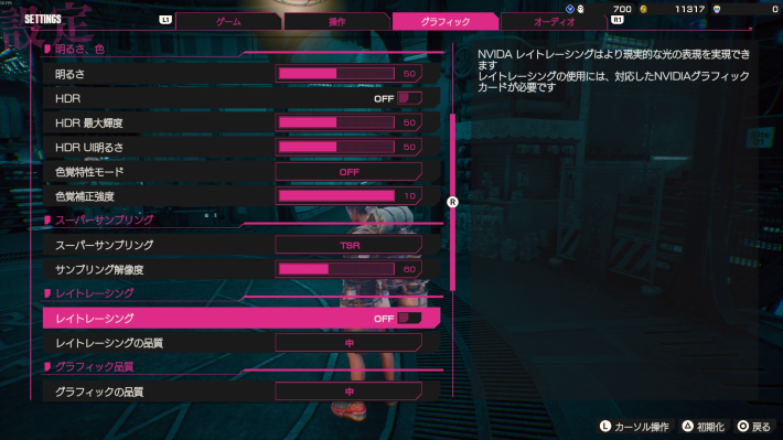 ゲームの動きが重いと感じるようなら、設定画面で「グラフィックの品質」や「レイトレーシングの品質」などを低に下げましょう。