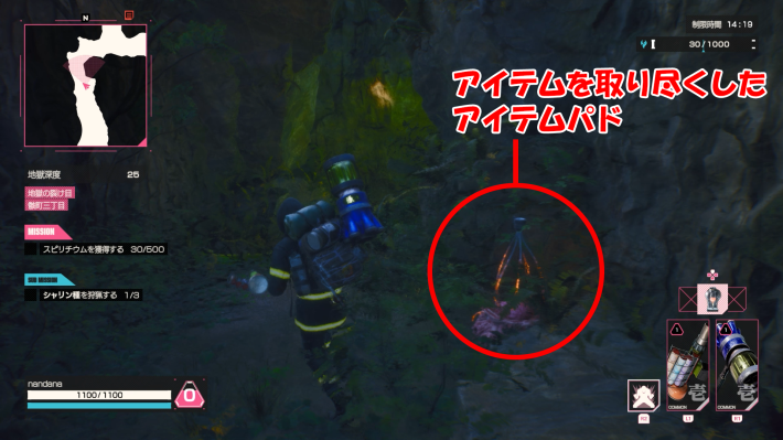 中にあるアイテムをすべて取ると、アイテムバド上部の球がなくなります。ただし、不要なアイテムをアイテムバドに入れると、球の状態が維持される点に注意です。すでにアクセス済みかどうかがわかりにくくなるので、不要なアイテムはなるべく捨てましょう。