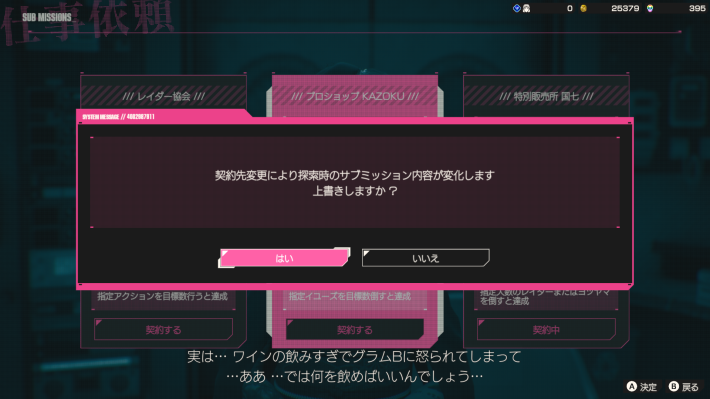 最初、サブミッションは「レイダー協会」のみですが、レイダーランクが上がると「プロショップKAZOKU」、「特別販売所 国七」のサブミッションが追加されます。ただし1度に選択できるサブミッションは1つだけです。