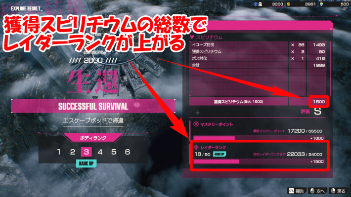 所持可能なスピリチウムは、ボディランクに比例します。ボディランクを高めて所持できる限界までスピリチウムを獲得することで、効率よくレイダーランクを上げられます。