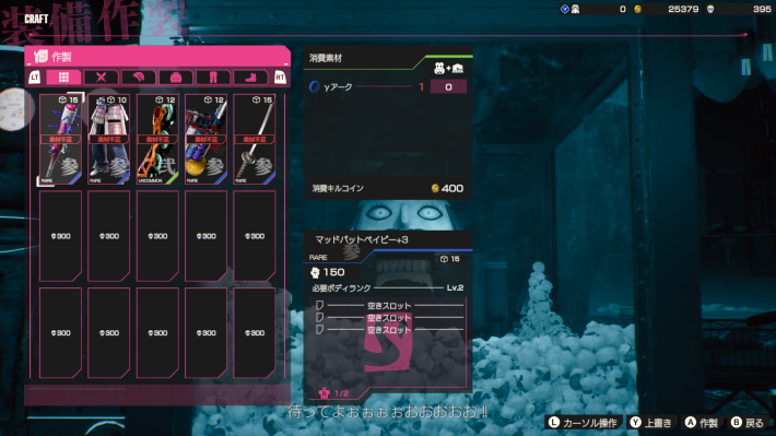 装備作製に使う、設計図をセットできる作製用スロットの数が増加します。初期が1個で、レイダーランクが上がると最大で5個まで増加します。