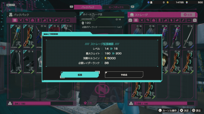 レイダーランクが上がると、ストレージ拡張枠がレベル5、9、13、17、20と段階的に増加していきます。拡張枠が増加したら、なるべく早めに最大までストレージを拡張しましょう。