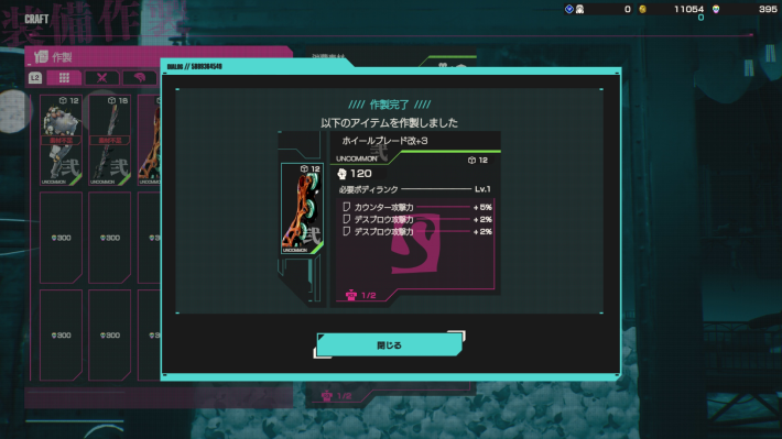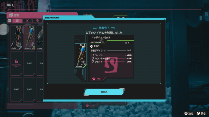 装備作製では、設計図に書いてあるスロットの数だけ特性が追加されます。特性はダメージに直結する「通常攻撃力+〇%」が付けばベストです。また、「ウェイト-〇%」も数字が大きければウェイトに余裕ができ、アイテムを持ち運びやすくなります。