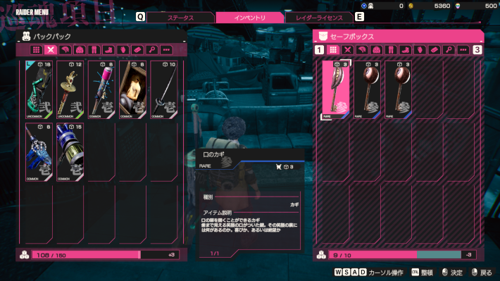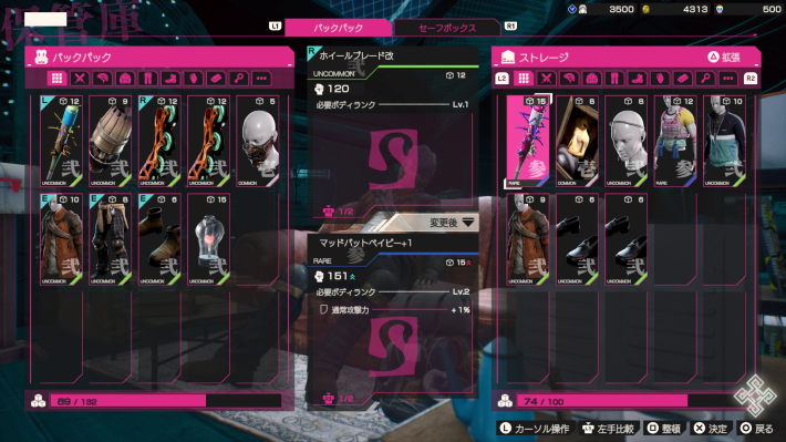 ホイールブレードや刀、バットのレアリティが高い装備を複数入手出来たら、ストレージに保管しておきましょう。レアリティ弐や参の武器を入れておくと、死んでやり直すときにスムーズに探索が進むようになります。