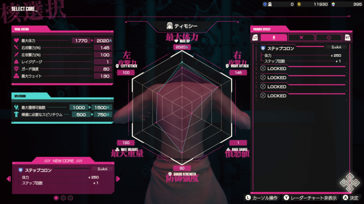 ボディランクが上がるときに得られるコアは、「ステップ回数+1」や「体力+250」などを優先的に選びましょう。「レイジゲージ+1」でデスブロウを連発するのも強力です。