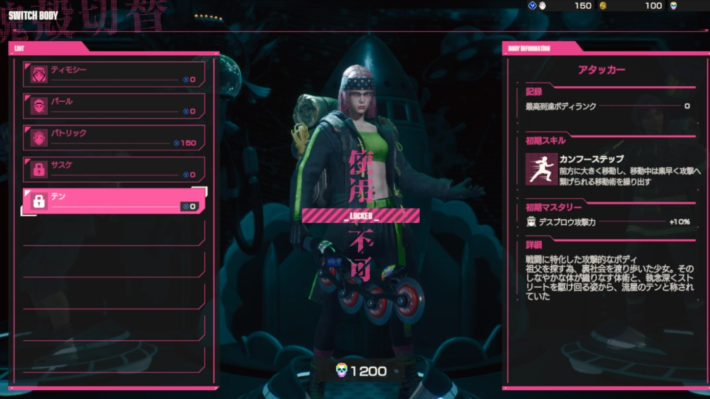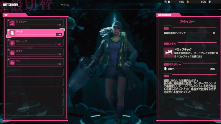 パールは攻撃に特化したボディで、マスタリーも通常攻撃力やデスブロウの攻撃力を高めるものが多いです。能力を踏まえ、敵の攻撃を受ける前に素早く倒すという立ち回りをしましょう。ドロップキックはやや使い方が難しく、うまく当てるには慣れが必要です。