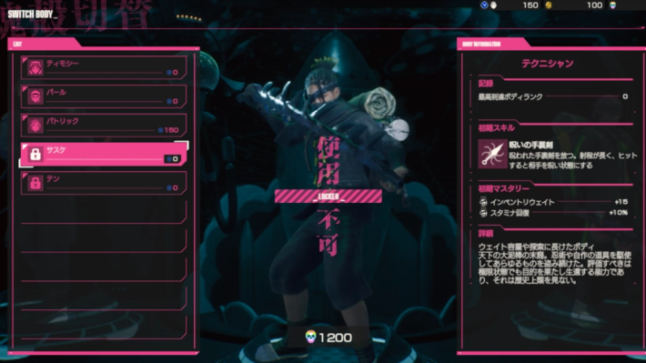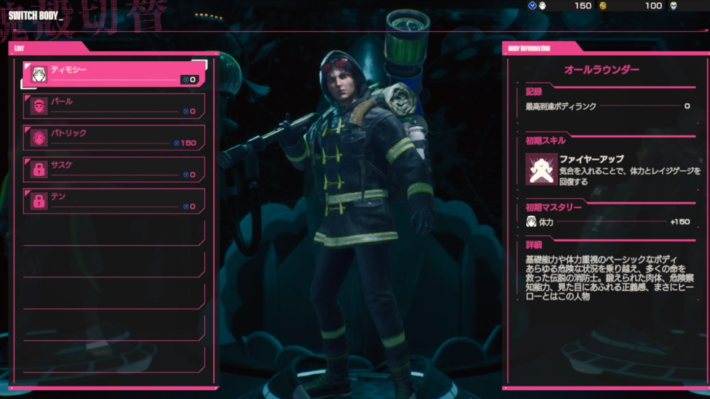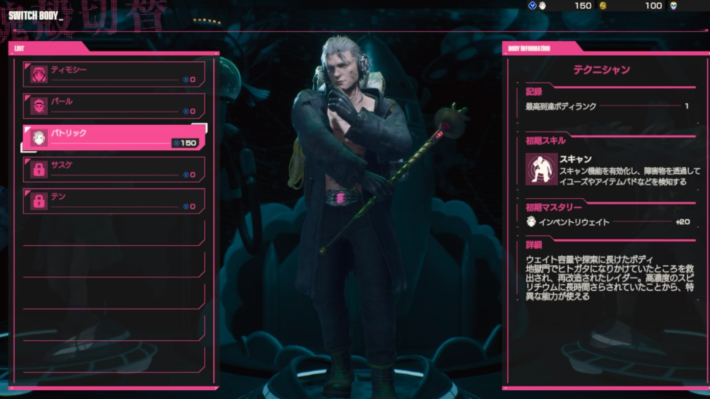 パトリックはインベントリウェイト(バックパックのウェイト)を増やしやすく、アイテムの収集に適したボディです。スキルのスキャンで敵やアイテムバドの位置を把握できるので、敵を回避して進みながら、いいアイテムを集めましょう。