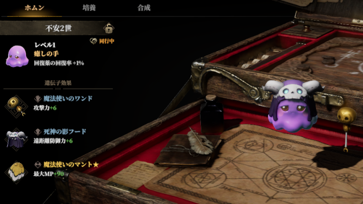 ホムンは最大まで成長させると、ホムン同士での合成が可能となります。合成により次の世代のホムンを入手可能で、ステータスが上がり戦闘力UPへ繋がります。