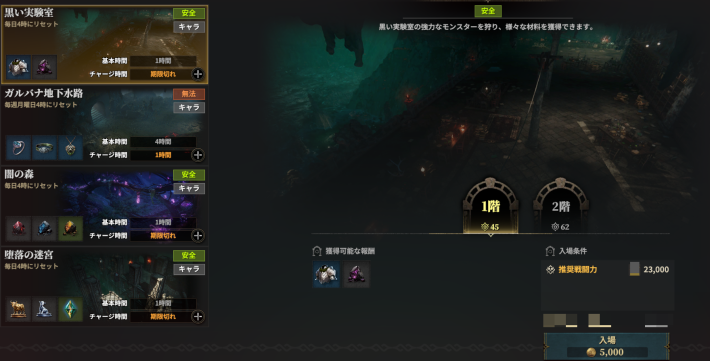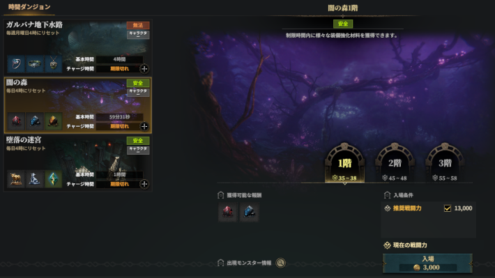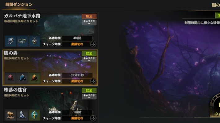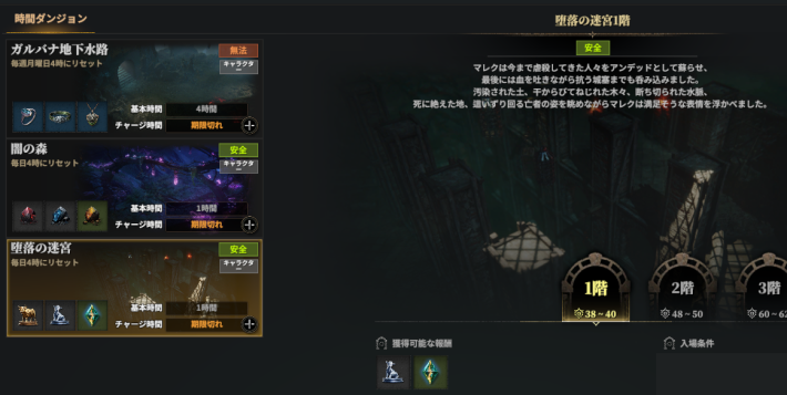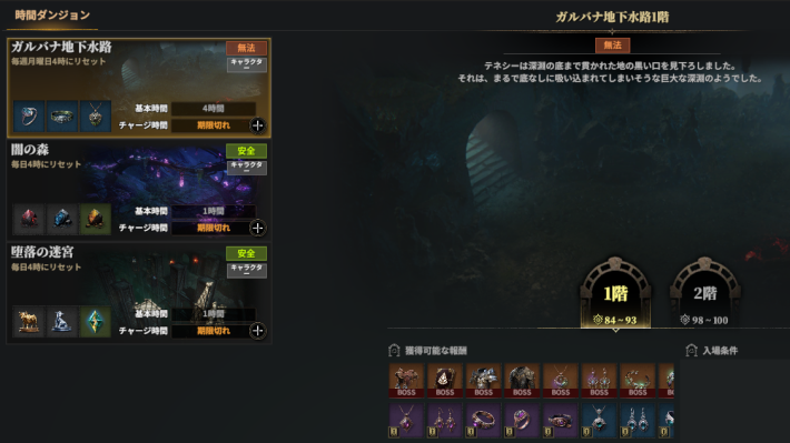 ガルバナ地下水路は、上記の闇の森、堕落の迷宮の2種のダンジョンに比べ、求められる戦闘力が高めです。アクセサリーや防具を含む様々な報酬が入手可能なので、入場可能になったら挑戦していきましょう。